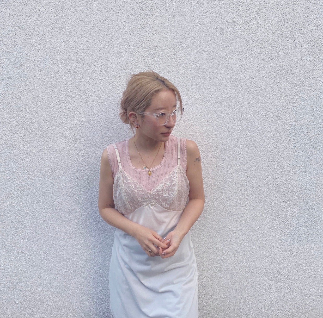 6つ目のコーデはpinkにvintageのランジェリーワンピースをレイヤードしたコーデです♡